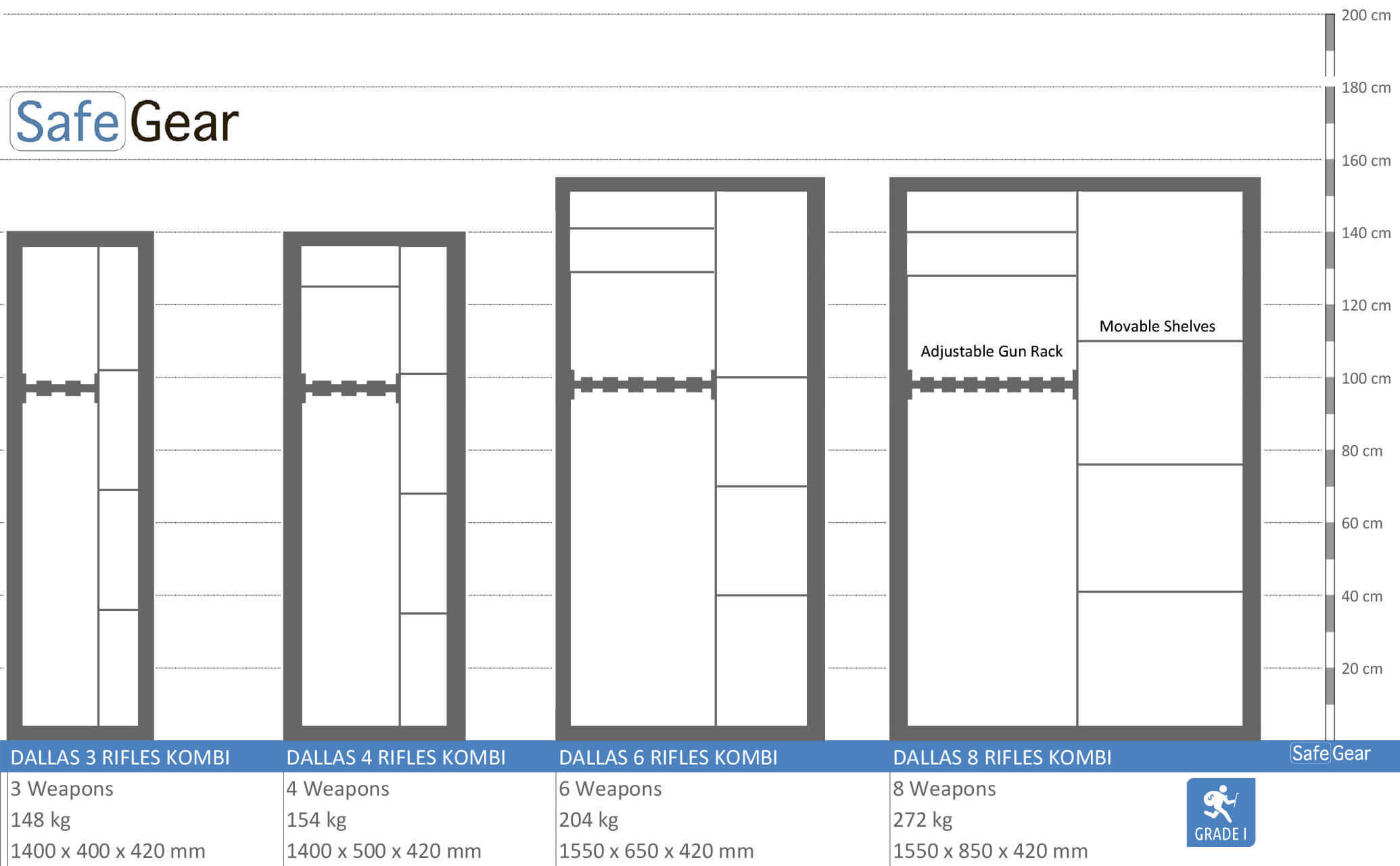Les armoires à fusils Dallas Combi sont équipés d’étagères pour le stockage de munitions, de documents, de matériel de chasse et/ou d’autres objets de valeur.