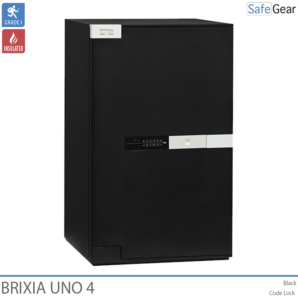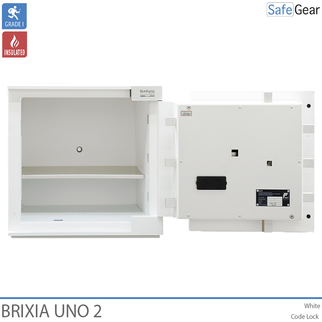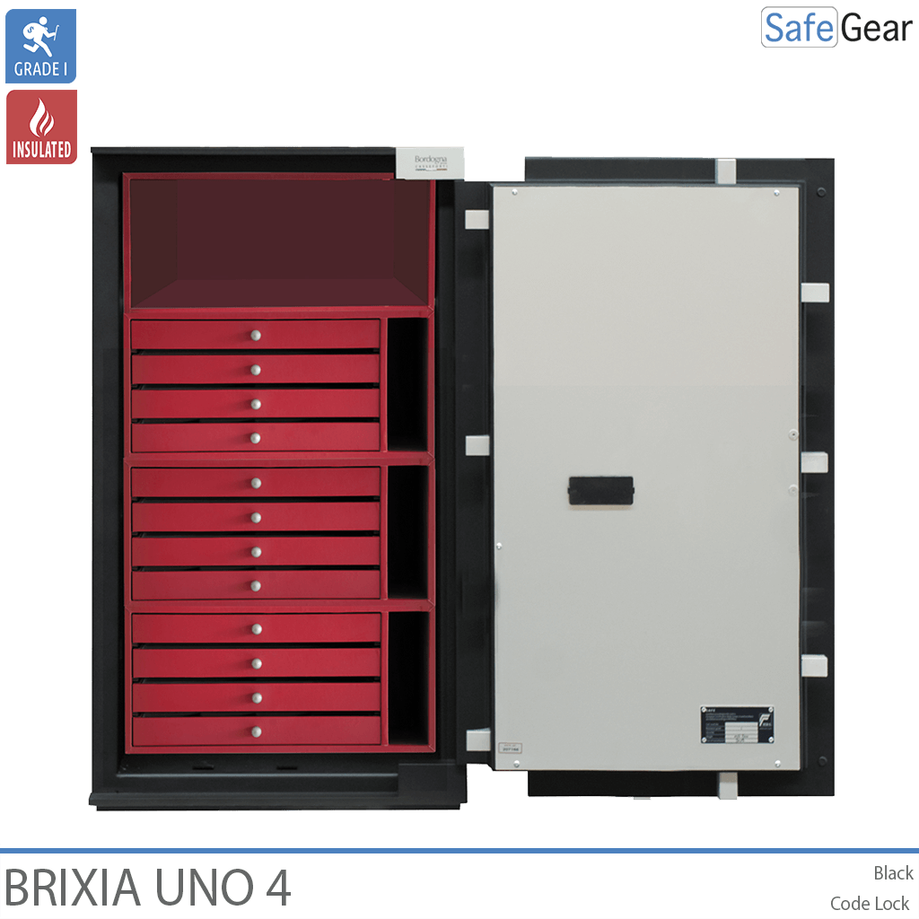 Les coffres Brixia Uno sont construits à l’aide de matériaux résistants à la chaleur afin d’améliorer leur protection contre le feu. Le coffre est conçu pour résister aux différentes méthodes d'attaque mécaniques et thermiques, et comprend également une protection spéciale qui résiste aux coups de marteau, aux foreuses et aux accessoires de coupe. La porte est verrouillée grâce à des pênes lourdes pour un maximum de sécurité. Le coffre dispose d’un code élégant. La poignée répond au toucher et disparais dans la porte lorsqu’elle n’est pas utilisée. La gamme Brixia Uno peut être fixée au sol ou aux murs. Brixia Uno peut être livré avec différents inserts pour conserver les bagues, les montres et autres objets de valeur.